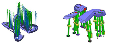 BOSS柱設計密集,高度60mm,后模的抱緊力大,卡扣布置密集,模具的脫模空間小。
