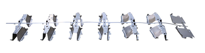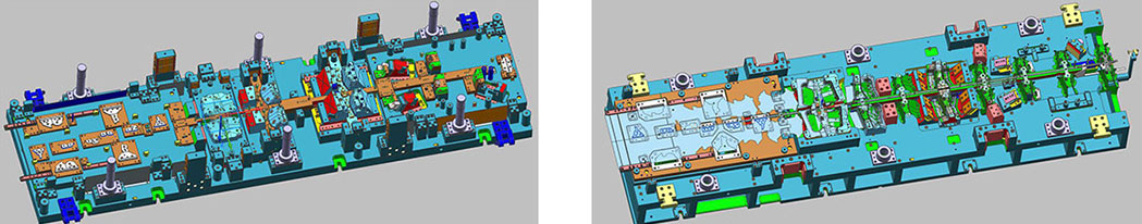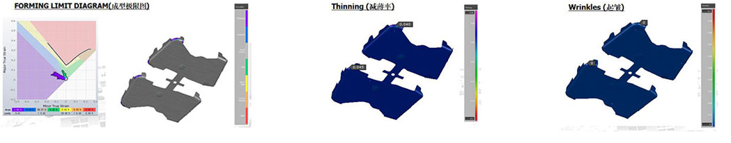 1.產品特征:產品高度是104mm,產品材質強度高,翻邊數值高,公差±0.5mm,此外,對于角度控制的很嚴格。 2. CAE分析顯示翻邊根部開裂,設計工程師巧妙的增加一處廢料解決了開裂問題。