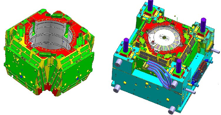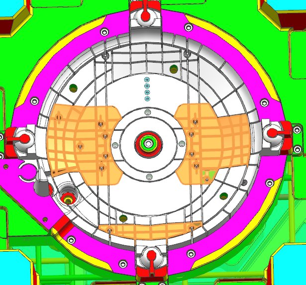 3、由于產(chǎn)品桶底的筋位較多冷卻不良,在設(shè)計時需要提前預(yù)估到,鋼料選用鈹銅(保證中間8個電機(jī)固定的螺釘柱精度)。
